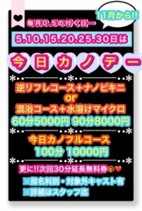 | 11月からは、今日カノデー♬ 【延長無料券の有効期限が長くなりました!】 *取得日の翌日以降~月末までが有効期限となります。 毎月5日 10日 15日 20日 25日 30日は今日カノデー!!! いつもより、お得に遊べます! 🌟逆リフレコース+ナノビキニ 60分5000円 イベントコース60分ご利用で次回15分延長無料券プレゼント🎁 90分8000円 更に、イベントコース90分以上のご利用で次回30分延長無料券プレゼント🎁 🌟混浴コース+水溶けマイクロ 60分5000円 イベントコース60分ご利用で次回15分延長無料券プレゼント🎁 90分8000円 更に、イベントコース90分以上のご利用で次回30分延長無料券プレゼント🎁 ♡今日カノフルコース♡ (お散歩・メンエス・水溶けマイクロ・逆リフレ・混浴) 100分 10000円!!!! 更に、イベントコース90分以上のご利用で次回30分延長無料券プレゼント🎁 *15分・30分延長無料券は、取得日の翌日以降~月末までが有効期限となります。 *各コース 指名料別途 *対象外キャストあり *イベント専用ナノビキニになります。 *キャスト都合により水着着用できない場合は、リフレコース30分無料券をお渡し致します。 *詳細はスタッフまでお問い合わせください。 |
