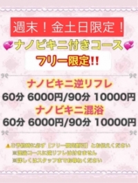 | あのフリーナノイベントが週末限定で復活! ⚠金・土・日 開催💕⚠ 👙フリーナノビキニイベント👙 ご利用条件 *フリー限定となり指名はできません。 ♡業界最安値ナノビキニ付きリフレコース♡ 『フリー限定割引』とご予約時にお伝えください! ナノビキニ付き逆リフレコース 60分6000円! 90分10000円! ナノビキニ混浴 60分6000円! 90分9000円! *逆リフレは、逆マッサージとなります。お触り可能な範囲は、キャストにサービス前に必ず確認の上、お楽しみください。 *対象外キャストあり *他割引併用不可 *詳しくはスタッフまで *イベント専用ナノビキニとなります。 *突発的な理由によりキャストが、水着を着用できない場合は、 次回ご利用可能なナノビキニ無料券を付与致します。 または、当日からご利用いただける15分延長無料を付与致します。 |