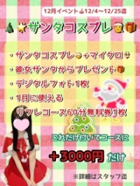 | 12月イベント クリスマス彼女サンタイベント♬ 開催期間:12月4日~12月25日迄 12月といえば、クリスマスにサンタクロース♡ 少し早めにあわてんぼうの彼女サンタがやってきた! 今年は、コースに追加することで、特典盛り沢山! 65分以上のコースに+【3000円】だけで下記特典!!! ①サンタコスプレ+マイクロビキニ ②彼女サンタからプレゼントとして、ご予約コース+10分延長無料! ③デジタルフォト1枚(ソロショットまたはツーショット) ④1月に使えるリフレコース60分無料券1枚 ※サンタコスは、クリスマス関連のトナカイ、雪だるまのコスプレの場合もございます。 ※基本の4コースを65分以上ご利用の場合+3000円にてご利用可能です。 ※無料券は、データ管理となり所持限度枚数はありませんが1日1枚までの使用となります。 ※他、割引との併用不可 ※期間中何度でも、ご利用いただけます。 ※その他、詳細はスタッフまで |