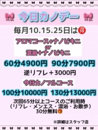 | 今日カノデー♡毎月10・15・25日は、超お得! 毎月10日 15日 25日は今日カノデー!!! 2024年6月から更に使いやすく!新しい今日カノデーコースを是非ご堪能ください💕 今日カノデーだけの超お得なコース内容 + 次回65分以上のコースに使える30分延長無料券もれなくプレゼント🎁 イベントコースをご利用いただいても十分にご満足いただけるよう内容、サービスも徹底化! (満足いただけない場合の、保証あり!アンケート回答必須) 【アロマコース+ナノビキニ】 極小サイズのナノビキニを着用した彼女から全身アロマオイルマッサージを受けるコースです。逆リフレも追加可能! 60分4900円 90分7900円 ・逆リフレ+3000円 【混浴コース+ナノビキニ or 水溶けマイクロ】 ナノビキニまたは水溶けマイクロを着用した彼女との密着混浴コースです。逆リフレも追加可能! 60分4900円 90分7900円 逆リフレ+3000円 ♡今日カノフルコース♡ (お散歩・メンエス・ナノビキニ or 水溶けマイクロ・逆リフレ・混浴)を 時間内お好きなようにご利用可能な超々お得コース! 100分 10000円!!!! 130分 13000円!!!!! ※各コース 指名料別途 ※延長30分5000円(延長料金の計算は、自動延長制となります。キャスト入室から退室まで、コース時間を1分でも過ぎた時点で延長料金が加算されお支払い頂きます。) *逆リフレ+3000円及びフルコースに付属の逆リフレでの接触可能範囲は、必ず事前にキャストへご確認の上、お楽しみいただくようお願いいたします。 30分延長無料券は、次回以降の65分以上のリフレ・メンエス・混浴・お散歩コースにご利用可能!(他割引併用不可 有効期限は取得日の翌日以降~翌月末日までとなります。 月内・最大所持枚数は1枚となります。データ管理となり実券のお渡しはありません。 *対象外キャストあり *キャスト都合により水着着用できない場合は、スタッフ確認の上、次回リフレコース30分無料券をお渡し致します。 その際、30分延長無料券もお渡し致します。 *詳細はスタッフまでお問い合わせください。 |