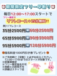 | 期間限定実施!早割り⏰!12~17時の早い時間帯のフリー事前ご予約でお得! ⏰早割⏰ 毎日12~17時スタートのフリー予約で、お得にご利用いただけます! ご予約時に【早割】と必ずお伝えください。 リフレコース料金そのままで+25分! 更に、次回から使える指名料金1000円引き券も📦! 例) 35分2500円⇒60分!2500円! 65分3900円⇒90分!3900円! 95分5900円⇒120分5900円! ※早割のお伝えがない場合、またはお部屋のご連絡が17時を過ぎた場合は早割対象外となります。 ※秋葉原派遣限定 ※指名不可 ※他割引との併用不可 ※詳細はスタッフまで ※対象外キャストあり ※指名無料券の有効期限は、付与日の月末までとなります。 |