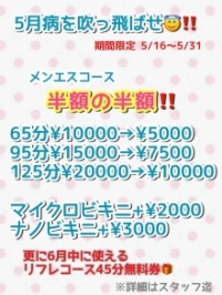 | 5/16~31まで 5月後半イベント! メンエスコースで5月病を吹っ飛ばせ! |