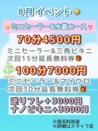 | 8月イベント! ミニセーラー&水着コース 70分4500円 100分7000円! |