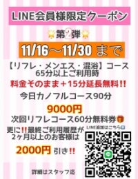 | LINE会員様限定クーポン♪ ⚠11/16~11/30まで!⚠ 店舗LINEを追加、ご予約いただいたお客様対象! 下記 延長無料サービスや特別コースをご利用可能です! 【リフレ・メンエス・混浴】コースを 65分以上ご利用時 料金そのまま+15分延長無料!! 今日カノフルーコース90分 9000円! 上記コースご利用で、 次回リフレコース60分無料券プレゼント🎁 更に! 最終ご利用履歴が2か月以上のお客様は、 コース料金が、2000円引き!!! ご予約時にLINEメッセージより『LINE限定クーポン』とお伝えください! *対象外キャストあり *他割引併用不可 *詳しくはスタッフまで *リフレコース60分無料券の有効期限は10月末日までとなります。 (所持枚数は1枚までとなります。) |