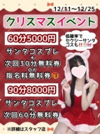 | 12月イベント クリスマス彼女サンタイベント♬ 開催期間:12月11日~12月25日迄 12月といえば、クリスマスにサンタクロース♡ 少し早めにあわてんぼうの彼女サンタがやってきた! 今年は、サンタコス付のリフレコースがお得! 60分5000円 次回30分延長無料券 または 指名料無料券をプレゼント! (データ付与となります。) 90分8000円 次回リフレコース60分無料券をプレゼント! (データ付与となります。) ※サンタコスは、低確率でセクシーサンタの場合がございます。 またクリスマス関連のトナカイ、雪だるまのコスプレの場合もございます。 ※無料券などは、データ管理となり所持限度枚数は1枚までとなります。ご使用後、再配布可能です。 無料券の利用期限は翌日から12月月末までとなります。1月以降は1月末まで1000円割引券としてご使用になれます。 ※他、割引との併用不可 ※期間中何度でも、ご利用いただけます。 ※その他、詳細はスタッフまで |