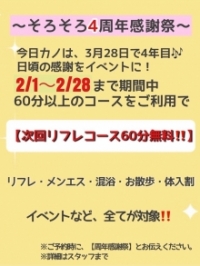 | 【そろそろ4周年感謝祭!】開催! 2月1日~2月28日の期間中!次回60分無料!! |