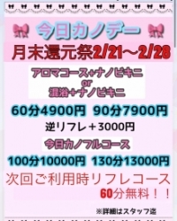 | 毎月10日 15日 25日は今日カノデー!!!ですが、 【月末感謝祭!】開催します! 2/21~2/28まで毎日今日カノデー♡ 今日カノデーだけの超お得なコース内容 + 次回65分以上のコースに使える30分延長無料券もれなくプレゼント🎁 ⇒期間限定で、リフレコース60分無料券プレゼントに特典グレードアップ! イベントコースをご利用いただいても十分にご満足いただけるよう内容、サービスも徹底化! (満足いただけない場合の、保証あり!アンケート回答必須) 【アロマコース+ナノビキニ】 極小サイズのナノビキニを着用した彼女から全身アロマオイルマッサージを受けるコースです。逆リフレも追加可能! 60分4900円 90分7900円 ・逆リフレ+3000円 【混浴コース+ナノビキニ or 水溶けマイクロ】 ナノビキニまたは水溶けマイクロを着用した彼女との密着混浴コースです。逆リフレも追加可能! 60分4900円 90分7900円 逆リフレ+3000円 ♡今日カノフルコース♡ (お散歩・メンエス・ナノビキニ or 水溶けマイクロ・逆リフレ・混浴)を 時間内お好きなようにご利用可能な超々お得コース! 100分 10000円!!!! 130分 13000円!!!!! ※各コース 指名料別途 ※延長30分5000円(延長料金の計算は、自動延長制となります。キャスト入室から退室まで、コース時間を1分でも過ぎた時点で延長料金が加算されお支払い頂きます。) *逆リフレ+3000円及びフルコースに付属の逆リフレでの接触可能範囲は、必ず事前にキャストへご確認の上、お楽しみいただくようお願いいたします。 リフレコース60分無料券は、翌日以降~3/31までが有効期限となります。 月内・最大所持枚数は1枚となります。データ管理となり実券のお渡しはありません。 *対象外キャストあり *キャスト都合により水着着用できない場合は、スタッフ確認の上、次回リフレコース30分無料券をお渡し致します。 その際、30分延長無料券もお渡し致します。 *詳細はスタッフまでお問い合わせください。 |
