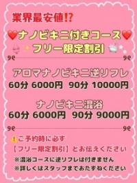 | ⚠緊急告知⚠ 【オープン1周年記念 前夜祭】 3/18~21 金土日月 4日間!!! ♡業界最安値ナノビキニ逆リフレ付♡『フリー限定割引』実施中! ♡業界最安値ナノビキニ逆リフレ付♡ 『フリー限定割引』とご予約時にお伝えください! アロマナノビキニ逆リフレ 60分6000円 90分10000円!! ナノビキニ混浴 60分6000円‼ 90分9000円!! |