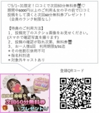 | 4月の口コミイベントがパワーアップ!! ♡5/1~31限定!口コミで次回60分無料券🎁♡ 期間中6000円以上のご利用&女の子の前で口コミ投稿をして頂くと次回60分無料券プレゼント! (会員のランク制限なし) 【特典のご利用方法】 1.投稿完了のスクショ画像をお見せください。 (スマホで確認写真を撮ります) 2.投稿の確認が取れ次第、無料券🎁 3.お一人様1回 利用期限5/31迄 *その他割引併用不可 *指名料別途 *対象外キャストあり 【後日の投稿の場合は、通常会員様 次回リフレコース60分1000円となります!】 口コミ情報局でシルバー会員様 または ゴールド会員様の場合は 次回リフレコース60分無料にてご案内致します!! 口コミ情報局はこちら⇒ https://fujoho.jp/index.php?p=shop&id=58965 【後日の口コミ特典のご利用方法】 投稿された際の投稿者名(情報局に登録しているニックネーム)をお伝え下さい。 情報局のマイページでユーザーネームが分かる所のスクショ画像を 当店予約用LINEで送って頂くか、直接女の子に画面をお見せ下さい。(女の子がスマホで確認写真を撮らせて頂きます) *投稿の確認が取れ次第の適用となります。 *リフレコース65以上をご希望の場合は差額のお支払いでご案内可能 *利用期限5/31迄 *その他割引併用不可 *指名料別途 *対象外キャストあり |