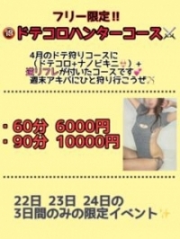 | 緊急告知!!!! 大サービス❣ 4/22~4/24限定!! 童貞を○すニット(通称ドテコロ)過激版+??ビキニ付き👀 4月のイベント【童貞狩りコース】が4/22~4/24の期間だけ、パワーアップ!! フリー限定!【⚔ドテコロハンターコース⚔】 〜ドテ狩りニット+逆リフレ付き〜 60分6000円 90分10000円 *対象外キャストあり *詳しくはスタッフまでお尋ねください。 |