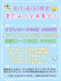 | 8月は、毎回リフレ30分無料券プレゼント! 8月イベント! 夏だよ!全員集合! |