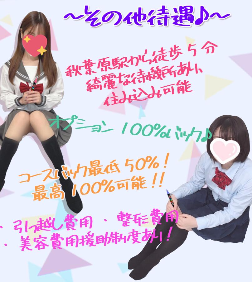 | <待遇> | 秋葉原駅から徒歩5分綺麗な待機所あり、住み込み可能 ・入店祝い金10~20万円支給制度あり! ・オプション100%バック♪ ・コースバック最低50%! 最高100%可能!! ・面接交通費、5000円支給制度あり、面接後、即、体験入店可能! ・体入保証3万円 ・完全日払い制 ・引っ越し費用・整形費用・美容費用援助制度あり! ・ノルマ・罰金一切なし |